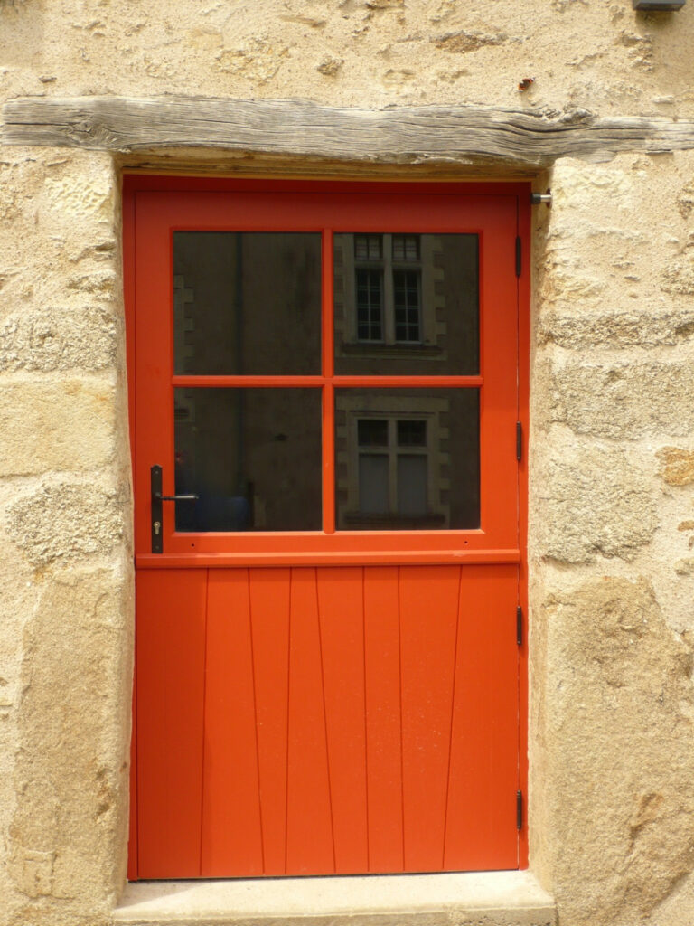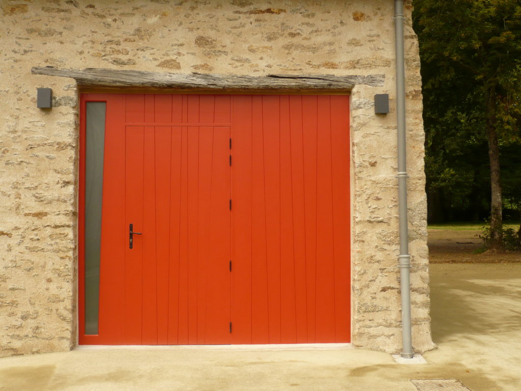 Menuiseries en chêne avec petits bois collés et faux intercalaires. Remplissage des soubassements de la porte et du portail avec calepinage des lames en biseaux.